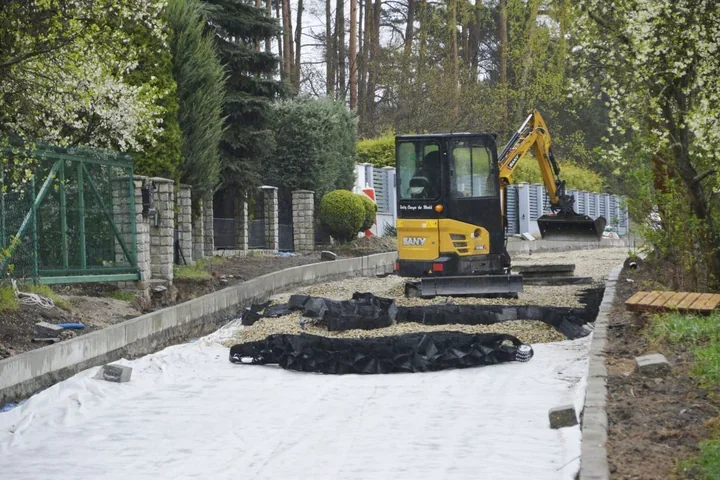 Obecnie układana jest geokrata, którą wypełnia się kruszywem. Dopiero po tym fragmencie robót przyjdzie czas na docelową podbudowę z kruszywa łamanego. Na końcu pojawi się właściwa warstwa wierzchnia z kostki. Taki porządek prac nie przyspiesza efektu wizualnego, ale porządkuje całą ulicę od spodu.