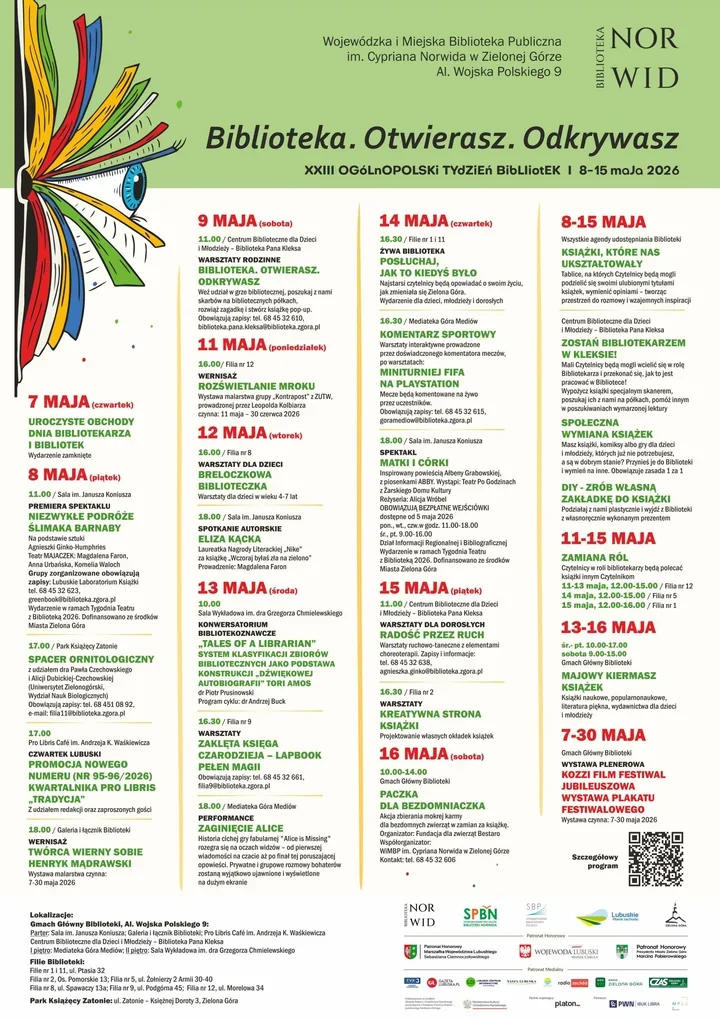 - Ogólnopolski Tydzień Bibliotek w Zielonej Górze ruszy 7 maja uroczystością z okazji Dnia Bibliotekarza i Bibliotek. Za tegoroczne hasło odpowiada Kaja Kobierzycka z WiMBP im. Cypriana Norwida, a sam slogan dobrze oddaje kierunek całej akcji – zamiast sztywnej oprawy ma być ruch, spotkanie i odkrywanie kolejnych przestrzeni biblioteki.