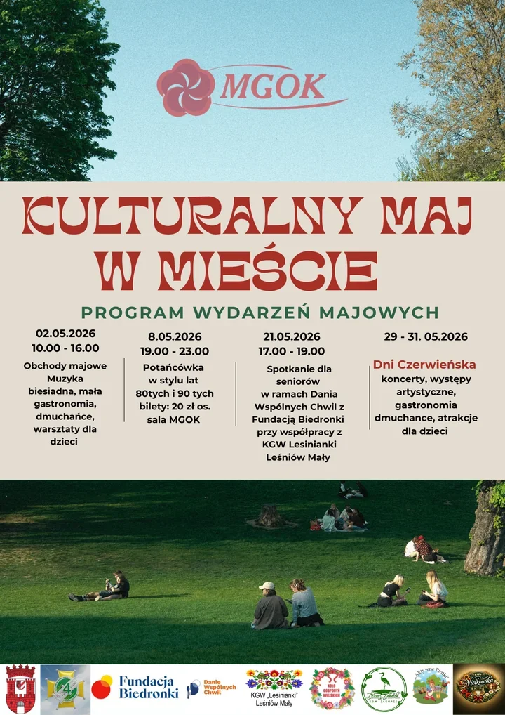 W połowie miesiąca, 21 maja, od 17:00 do 19:00 odbędzie się spotkanie dla seniorów przygotowane w ramach Dnia Wspólnych Chwil Fundacji Biedronki, we współpracy z KGW Lesinianki Leśniów Mały. To ważny element całego programu, bo obok zabawy i głośniejszych punktów stawia także na spokojniejsze, bardziej kameralne spotkanie.