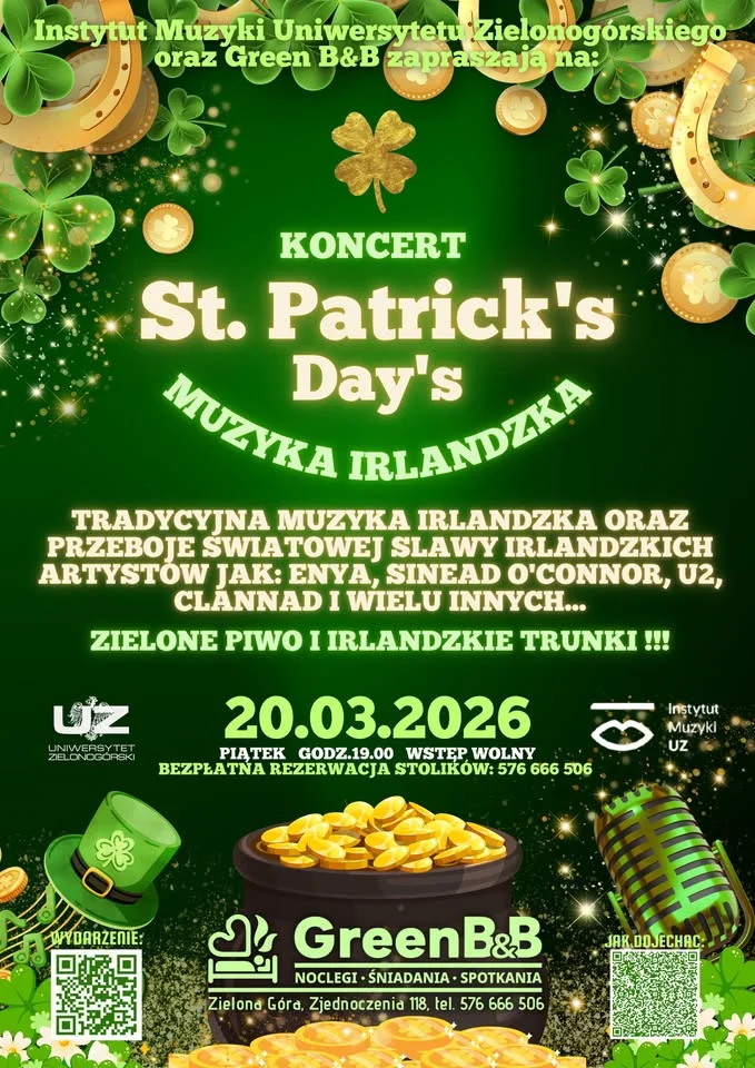 Wieczór pełen zielonej energii i muzyki, która potrafi porwać zarówno do tańca, jak i do zadumy — tak w skrócie można opisać piątkowy koncert z okazji Dnia Świętego Patryka w kameralnym Green B&B. Wpadnij posłuchać żywych, irlandzkich brzmień w wykonaniu studentów Instytutu Muzyki UZ — będzie muzycznie i w klimacie