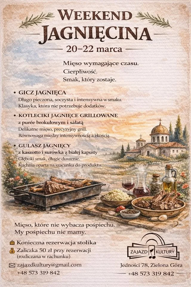 Weekend, który stawia tempo jagnięciny: długie pieczenie, cierpliwe duszenie i dania, które smakują jak powolna opowieść. Wpadnij na naturalne smaki i domową atmosferę — warto zarezerwować stolik.